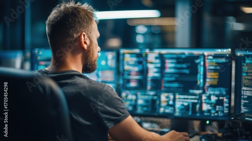 A man works at a multi-monitor computer setup, writing and analyzing code in a modern, dimly-lit office environment