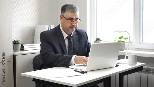 A man works on a computer. He looks at the screen and types on the keyboard.