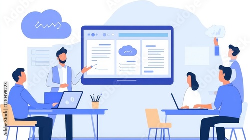 manager, meeting, leadership, teamwork, collaboration, presentation, digital, cloud, technology, workspace, innovation, project, whiteboard, laptop, file, access, brainstorming, productivity, communication, strategy, goal, remote, connectivity, engagement, idea, solution, corporate, planning, discussion, online, organisation, visual, datum, device, software, networking, efficiency, feedback, analysis, resource, tool, workflow, integration, dynamic, development, synergy