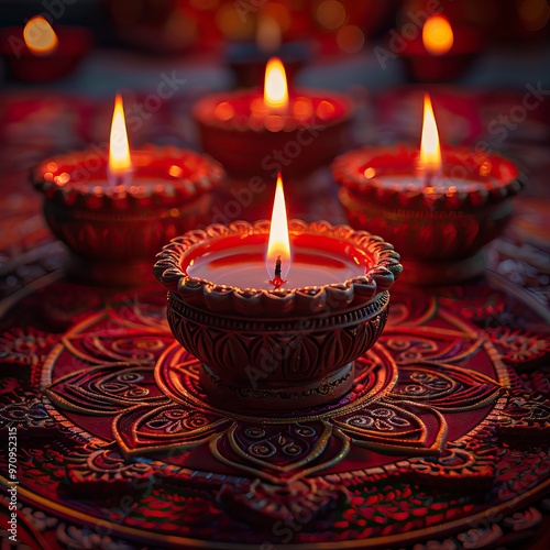 A mandala pattern composed of red and orange lights, with five oil lamps placed in the center surrounded
