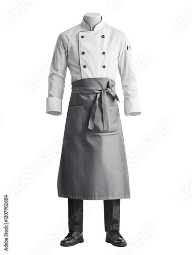 chef, uniform, jacket, coat, apron, grey, white, black, mannequin, model, display, clothing, fashion, style, kitchen, cooking, eatery, food, professional, attire, culinary, buttons, sleeve, trousers, pant, shoe, footwear, accessory, textile, fabric, design, elegant, stylish, formal, workspace, outfit, workwear