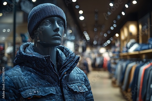mannequin, winter clothes, fashion, retail, store, clothing, apparel, blue, grey, hat, beanie, blurred background, bokeh, light, display, shopping, consumerism, style, trendy, warm clothes
