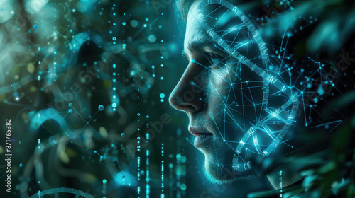 man, face, deoxyribonucleic acid, digital, pattern, glowing, overlay, science, technology, genetic, human, biology, abstract, futuristic, innovation, research, medicals, health care, artificial, intelligence, network, connection, datum, code, line, dot, blue, green, background, illustration, concept, future, progress, evolution, life, nature, art, graphic, design, computer, graphic, imagery, visual, artwork, render, rendered, rendering