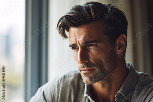 man, portrait, closeup, contemplation, thoughtfulness, introspective, gaze, looking away, window, blurred background, casual clothes, shirt, beard, hair, facial hair, male, adult, mature, human, face, expression, emotion, mood, serious, contemplative, pensive, atmospheric, natural light, portraiture, candid, realistic, studio photography, lifestyle, modern, contemporary