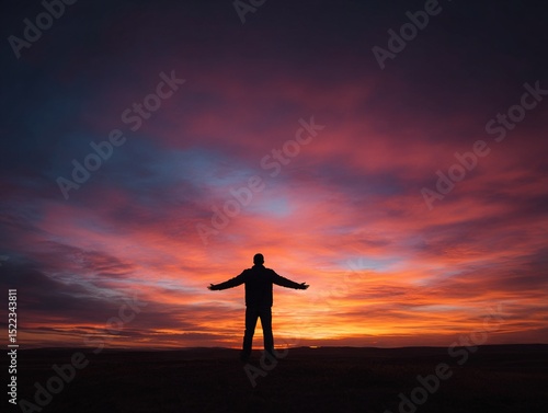 A man's silhouette stands with arms wide open against a vividly colored sunrise or sunset sky, featuring brilliant oranges, reds, and purples.