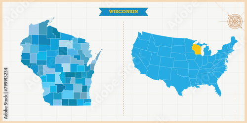A Map highlighting Wisconsin in the USA Map, Wisconsin and USA modern map with Colorful Hi detailed Vector, geographical borders