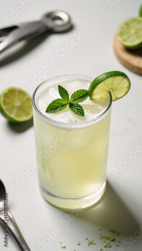 A margarita cocktail glass against an isolated backdrop showcases a beverage with lime and mint in a bar-themed alcoholic drink rendition