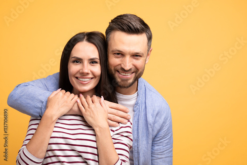 caucasian, european, family, couple, married, together, love, affection, isolated, happiness, togetherness, marriage, joy, hugs, smile, human relationships, friendship, connection, portrait, yellow background, casual clothes, warmth, intimacy, modern, cheerful, husband, wife, playfulness, fun, oneness, joyfulness, simple, colourful, young adult, positive, candid, expression, lifestyle, posing, natural, harmony, engaged, bonding, genuine, carefree