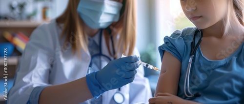 A masked female doctor in a lab coat vaccinates a girl in a medical setting, emphasizing safety protocols.