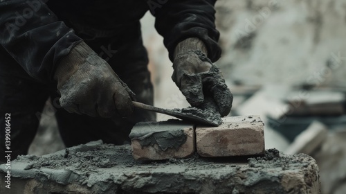 A mason laying bricks at a construction site. Featuring precision and craftsmanship