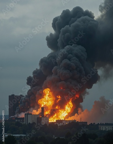 explosion, fire, city, building, smoke, plume, urban, black, power, destruction, flames, station, industrial, aftermath, alert, cleanup, containment, crisis, critical, danger, disaster, emergency, energy, environmental, evacuation, hazardous, heat, researching, intense, investigation, recovery, rescue, safety, toxic, urgent, warning, burning, sky, air pollution, burn