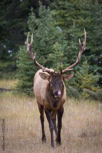 tree, call, alert, behaviour, environment, canadian, huge, rocky mountain, mountain, big game, meadow, mating season, strong, rack, jasper, outdoors, canada, bugle, big, america, beautiful, september, park, national, wilderness, forest, antler, bull, grooved, elk, bull elk, male, fall, wildlife, nature, autumn