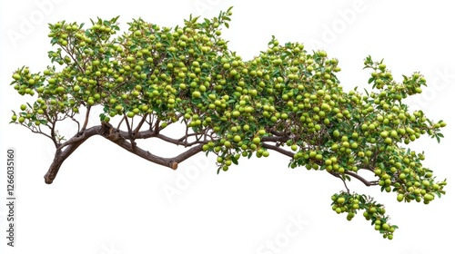 A mature myrobalan tree with small clustered green fruits, set against a white background. No people, no text.