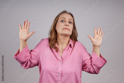 A mature woman with doubts, refusal, raised her palms. Isolated shot on gray background