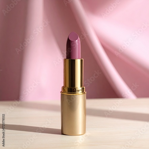 lipstick, mauve, pink, gold, cosmetic, beauty, product, make-up, shade, cosmetic, cardboard box, luxury, elegant, modern, glamour, fashion, style, image, still, life, close, up, texture, surface, wood, light, shadow, drape, fabric, design, advertising, promotion, high, end, gloss, satin, soft, polished