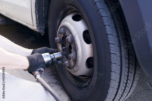 A mechanic at a service station replaces a car wheel, a worker's hands in black fuel oil and a tool for unscrewing bolts close-up near the wheel. Tire service, workflow