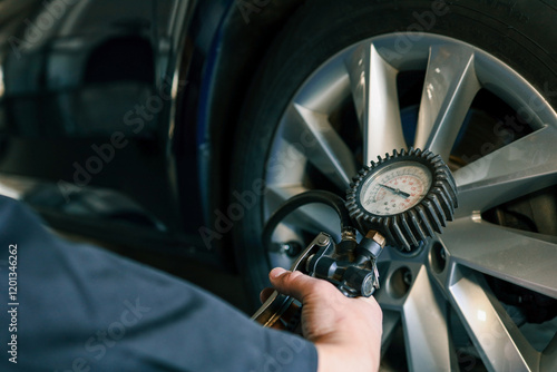 A mechanic checks tire pressure with a gauge during routine car maintenance in a garage. Focus on the wheel and the instrument ensuring optimal vehicle safety and performance
