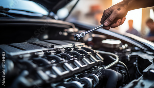 A mechanic uses a wrench to work on a car engine, highlighting precision, skill, and maintenance in an automotive workshop setting.