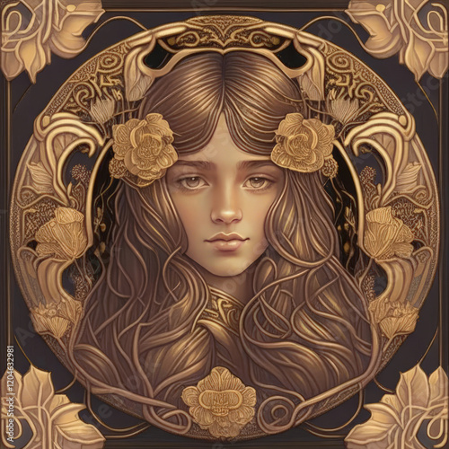 style, hair, art, flower, ornament, rosette, generated, fairy, glamour, frame, witchcraft, youth, fantastic, magician, sorcerer, vintage, digital, image, retro, beauty, ai, illustration, face, elegance, medallion, portrait, beautiful, young, woman, rose, concept, cute, girl, female, art nouveau, arabesque, gold, hairpin, chaplet, black background