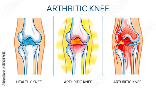 A medical illustration showing the anatomy of a healthy knee and an arthritic knee. The image is divided into three sections side by side