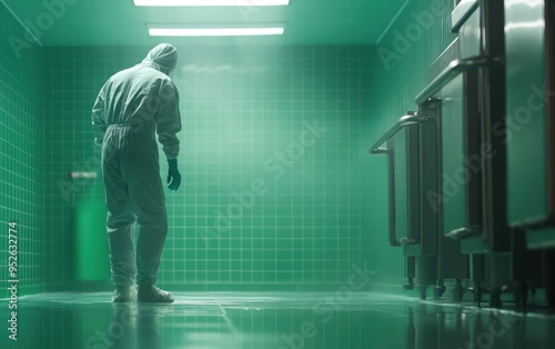 A medical worker in protective gear stands in a sterile, foggy environment, emphasizing hygiene and safety in healthcare.