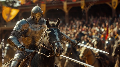 A medieval tournament with knights wielding swords, crowds cheering in the stands