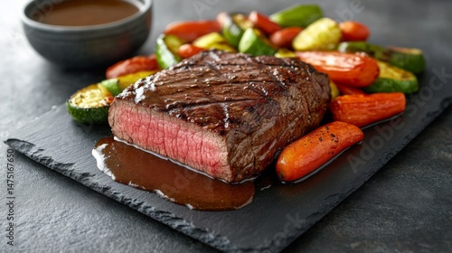 A medium-rare steak cut into thick slices, served with a rich gravy and roasted vegetables, plated elegantly on a dark slate serving board.
