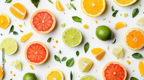 A medley of citrus fruits, including lime, lemon, and grapefruit, arranged on a white background