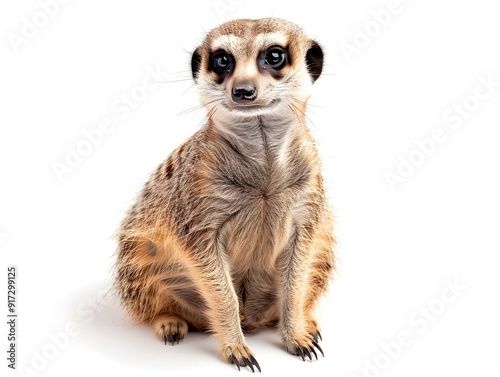 A meerkat sits alert with a curious expression against a plain background