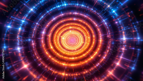 mesmerizing, arrangement, concentric, ring, aglow, plasma, radiating, wave, radiant, light, deep, blues, core, fiery, red, orange, outer, edge