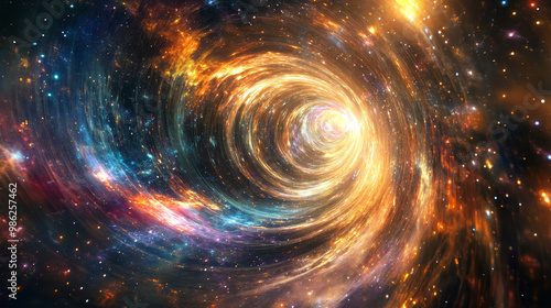 A mesmerizing cosmic vortex spirals through vibrant universe filled with stars and colorful nebulae, evoking sense of wonder and exploration