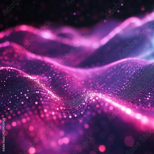 A mesmerizing digital abstract featuring flowing pink and purple waves, illuminated with glowing particles. The wavy lines create a dynamic, futuristic landscape against a dark background, evoking