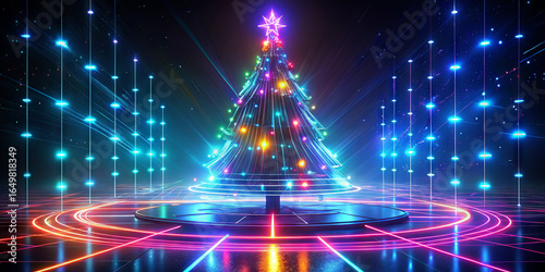 A mesmerizing digital Christmas tree stands in a futuristic setting, adorned with colorful lights and surrounded by glowing patterns, celebrating the holiday spirit