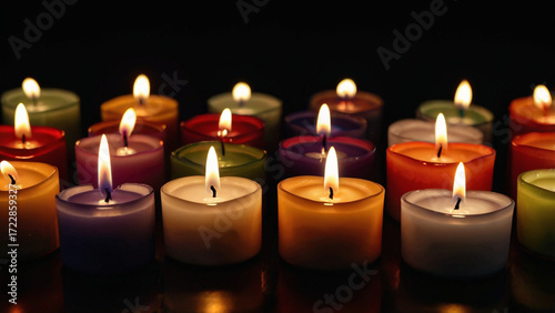 A mesmerizing display of candlelight, with a multitude of vibrant, colorful candles casting a warm and inviting glow against a dark backdrop, creating a serene and intimate atmosphere