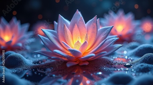 A mesmerizing display of fractal petals glowing with spectral light, abstract waveforms rippling through space, particles dissolving into pure color