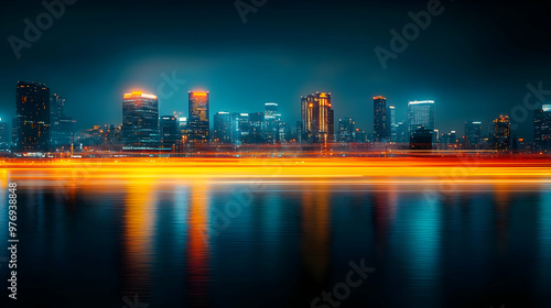 A mesmerizing view of a cityscape at night with light trails reflecting in the water.