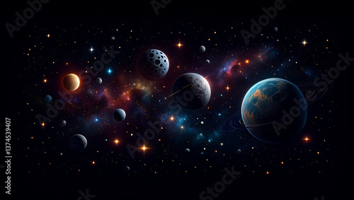 A mesmerizing view showcases multiple celestial bodies including planets, moons, and stars amidst a colorful galaxy. The vastness of space is highlighted by swirling cosmic colors and radiant lights