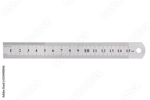 A metal ruler with a scale of up to 15 centimeters is isolated on a white background.