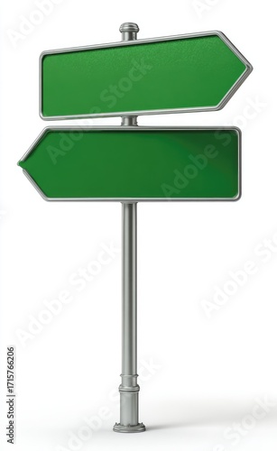 signs, signs, arrow, arrow, green, blank, direction, direction, way, way, road, path, journey, travel, guide, guidance, pointer, pointing, indicator, metal, metallic, pole, post, support, empty, clear, space, 2, double, left, right, opposite, choice, decision, option, destination, navigation, route, information, communication, transportation, symbol, graphic, design, illustration, isolated, background, white, vertical