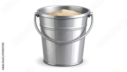 bucket, sand, metal, silver, pail, tan, isolated, white, background, shiny, handle, filled, container, scoop, texture, grain, granular, construction, material, light, shadow, clean, empty, full, beach, toy, children, play, sandbox, childhood, summer, holiday, vacation, art, design, object, graphic, illustration, three-dimensional, render, mock-up, nobody, realistic, smooth, simple, minimalist