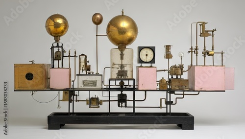 A meticulously crafted, intricate mechanical model, showcasing a complex system of interconnected brass gears, tubes, and components, with striking pink blocks and a neutral backdrop.