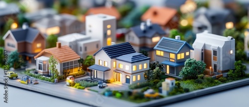 A meticulously crafted miniature model of a residential neighborhood at night with diverse houses illuminated by warm glowing and beautiful landscaping