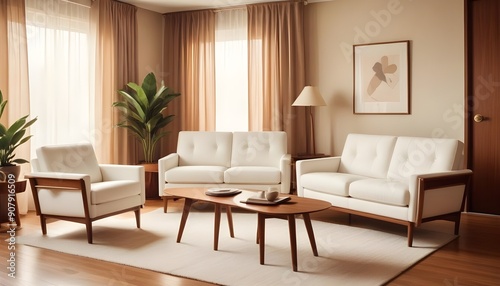 A mid-century style home interior design of a modern living room showcases a white sofa and brown leather armchairs