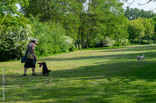 a middle aged woman taking her dogs for a walk in the park during lockdown