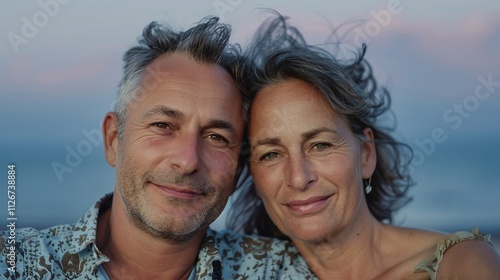 A middle-aged couple embraces set against a serene backdrop of a blue sky with pink clouds.