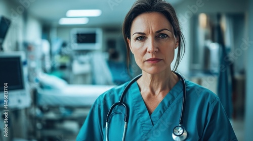 nurse, female, middle, aged, european, health care, hospital, portrait, medicals, professional, serious, standing, stethoscope, scrub, uniform, clinic, doctor, patient, room, wellness, caregiver, exam, health, system, support, staff, environment, clinical, assistance, hygiene, treatment, duty, attention, skill, life events, sharpened, team, compassionate, caring, profession, service, dedication, role, safety, trust, quality, expertise, communication, equipment