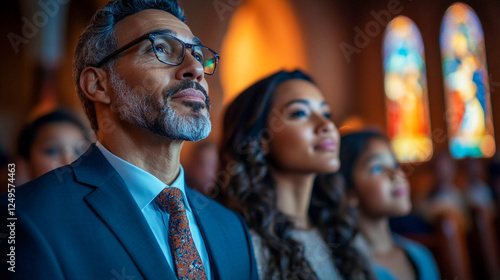 family, church, religion, faith, prayer, assembly, ceremony, man, woman, girl, suit, goggles, grey hair, beard, dark hair, light, soft focus, atmosphere, calmness, piety, spirituality, oneness, father, mother, daughter, concentration, mindfulness, peace, worship, mood, contemplation, harmony, sincerity, hope, devotion