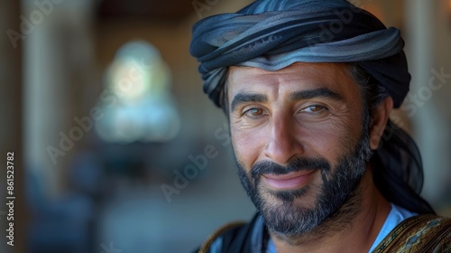 A middle-aged man with a beard wearing traditional cultural attire, his kind smile creating an inviting and warm atmosphere as he looks directly into the camera.