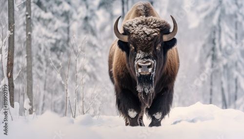 A mighty American Bison thick fur covered with frost and snow, Bison walks in extreme winter weather, standing above snow with a view of the frost mountains