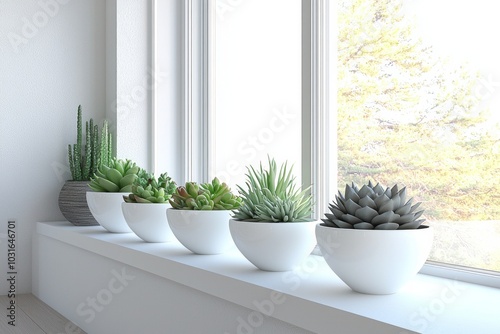 A minimalist arrangement of succulents in white pots on a clean, modern windowsill.